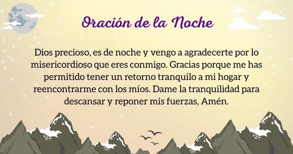 Quiero darte gracias esta noche, Padre celestial, por mi familia, gracias porque a través de ellos me manifiestas tu amor, en cada uno de los momentos bonitos que pude compartir con ellos. Señor mío, regálame la dicha de tener un día más a su lado, mantennos unidos y con mucha disposición para tu obra. Ayúdanos a orar juntos y aumenta nuestra fe en medio de las pruebas y dificultades.