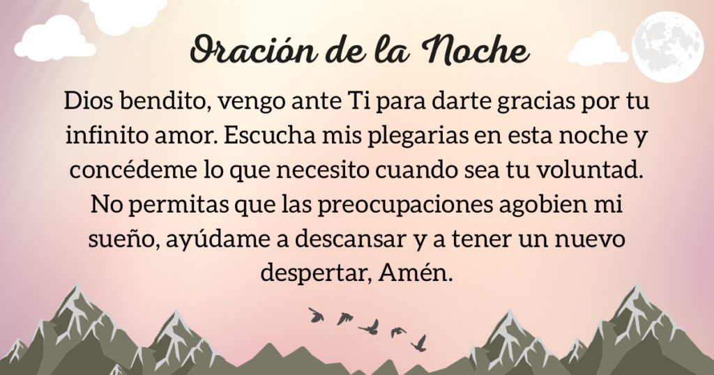 Señor misericordioso, una noche más ha llegado a mi vida y me pongo en tu presencia porque quiero darte, en primer lugar, las gracias porque hoy me has colmado de bendiciones y me has dado mucho más de lo que necesito. Gracias, mi Dios hermoso, porque has guiado mis pasos y me conduciste a tu vera, me protegiste de todo mal y me ayudaste a regresar sano y salvo a mi hogar.