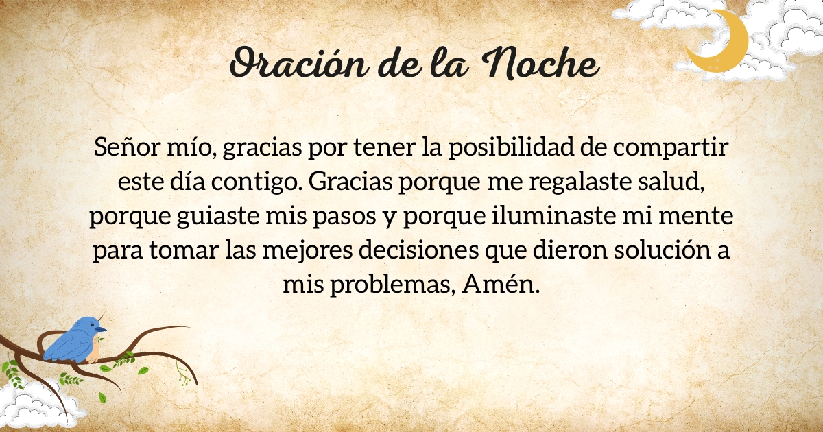Cae la noche y una vez más es un buen momento para acercarnos a Dios y pedirle su bendición para esta noche. Con un corazón contrito, pídele que te cuide en tus sueño y te dé el descanso que necesitas para despertar dispuesto a vivir un nuevo y mejor día. Que esta oración te ayude … Leer más