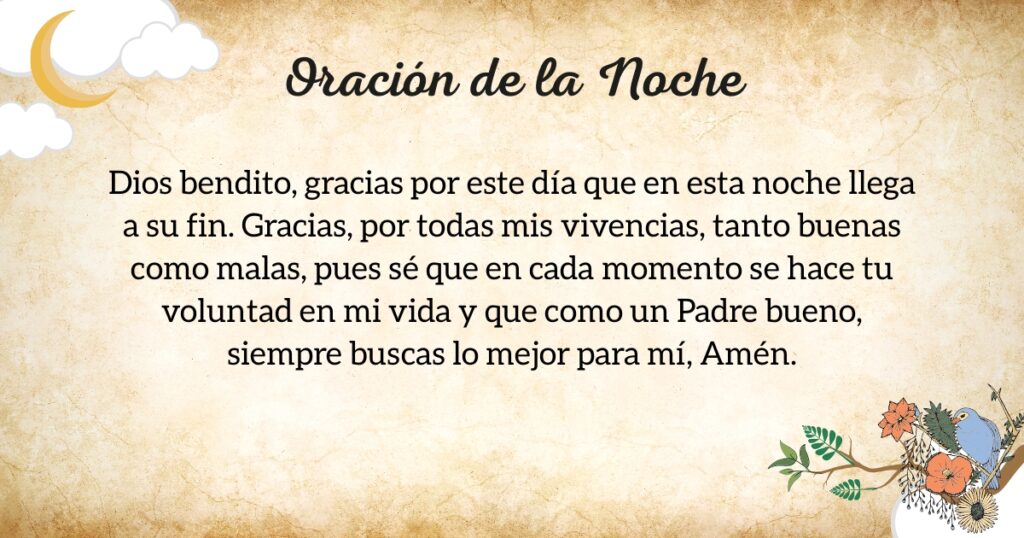 Padre amado, todo de mí te pertenece. Quiero poner esta noche bajo tu control, dame tu paz y tu calma para estar en concordia contigo. Permíteme descansar para recuperar las fuerzas que gaste este día.