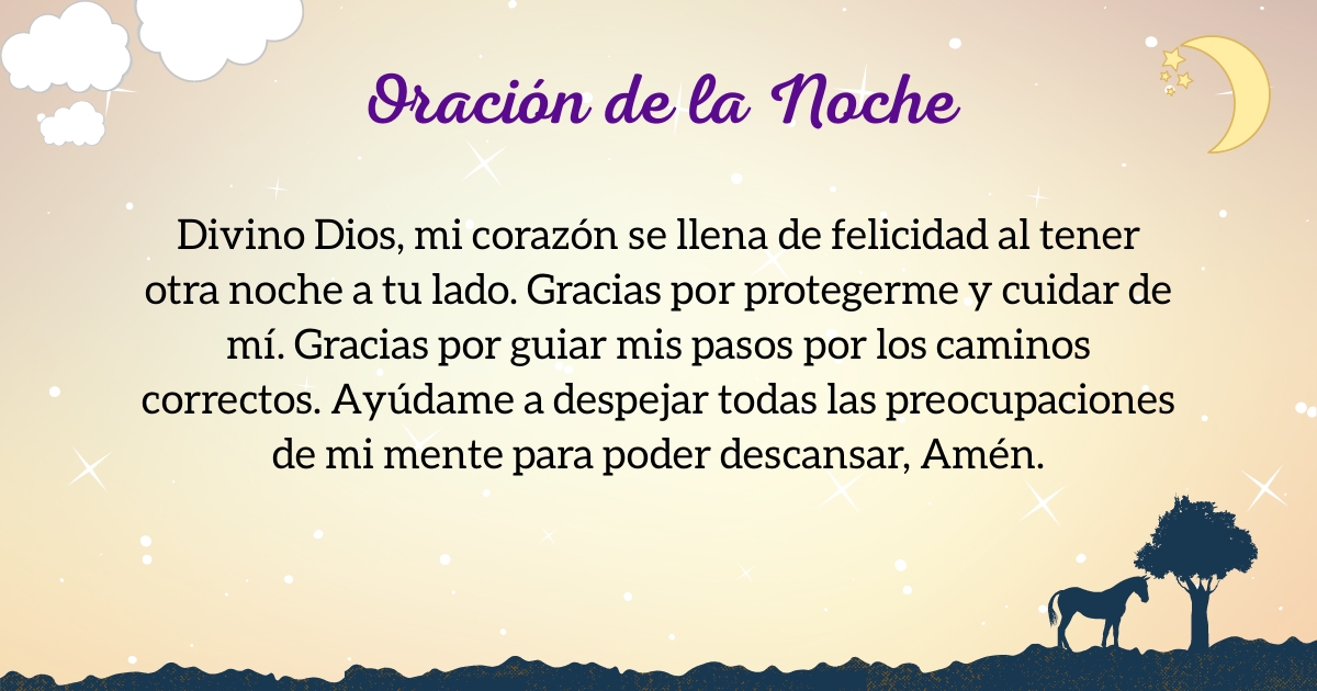 Es de noche y es momento de recordar que pase lo que pase, Dios nunca nos fallará, pues Él obra según su propio tiempo. Disponte en oración y pídele a nuestro Padre amoroso todo lo que tu corazón anhela, verás que Él te dará lo que necesitas en el momento justo. Que esta oración sea la mejor forma de disponerte a descansar.