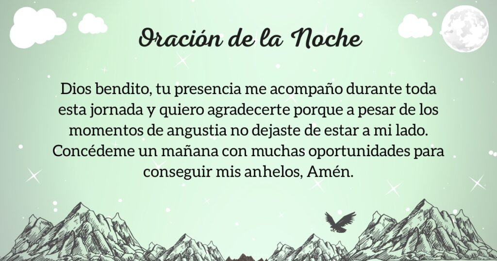 Las estrellas cubren el cielo y antes de disponerte a descansar, entrégale a Dios tu oración, pues si tienes fe en Él, las cosas saldrán bien. Recuerda que Él es nuestro Padre y todo lo dispone para el bienestar de sus hijos. Que a través de esta plegaria puedas encontrar la paz y la tranquilidad que necesitas para culminar este día con alegría.