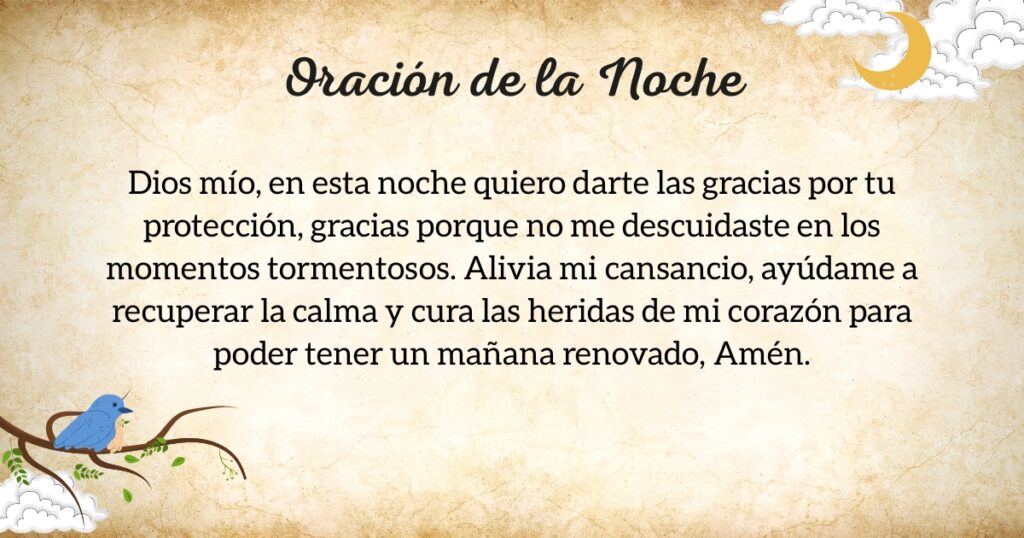 ¡Gracias Padre por amarme y protegerme en mi camino! En esta noche dale gracias a Dios por todo lo que ha hecho por ti en este día y por todo lo que seguirá haciendo. Pídele que bendiga tus planes, tus salud, tu hogar, tus finanzas y tu vida por completo, pues Él sabe lo que necesitas.