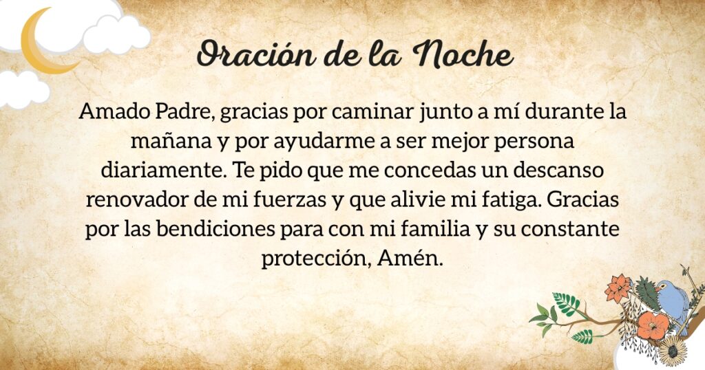 Padre de bondad, gracias por todo lo que me ha acontecido en esta jornada, por los momentos buenos y malos que me tocaron pasar. Gracias porque me has permitido participar de momentos hermosos con mi familia y porque he aprendido de todos ellos. Cúbreme con tu manto esta noche y protege mis sueños de las acechanzas del enemigo.