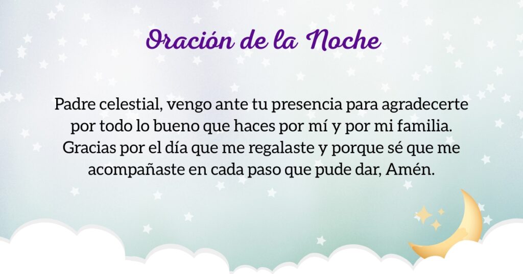 Es de noche, Dios de mi vida, quiero agradecerte por todas las bendiciones que pusiste en mi día, por las cosas que conseguí, por los momentos en que amé, por todo lo que compartí con las personas que más quiero, por las buenas noticias que recibí y por todo lo bueno que me pasó hoy.