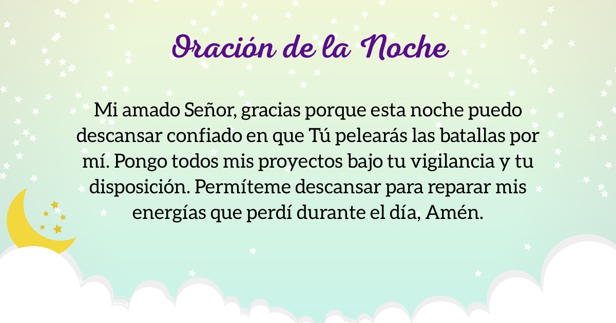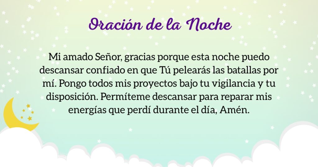 Llegó la noche y es momento de darle gracias a Dios por su compañía durante todo el día. Recuerda que la oración tiene poder, entrégale tu corazón a Dios a través de esta oración y ve a descansar tranquilo, por el Señor sostiene tu vida.